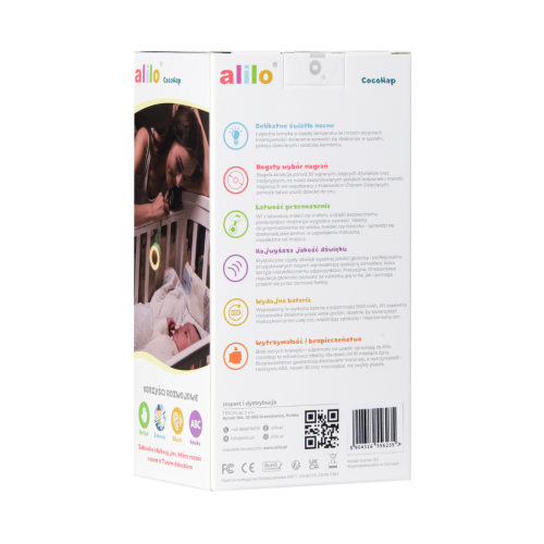Brak ostrych krawędzi i odporność na upadki sprawiają, że Alilo CocoNap to odtwarzacz idealny dla dzieci od 18 miesiąca życia. Bezpieczeństwo gwarantują atestowane materiały, a wytrzymałość – tworzywo ABS, nawet 30 razy mocniejsze, niż zwykły plastik.