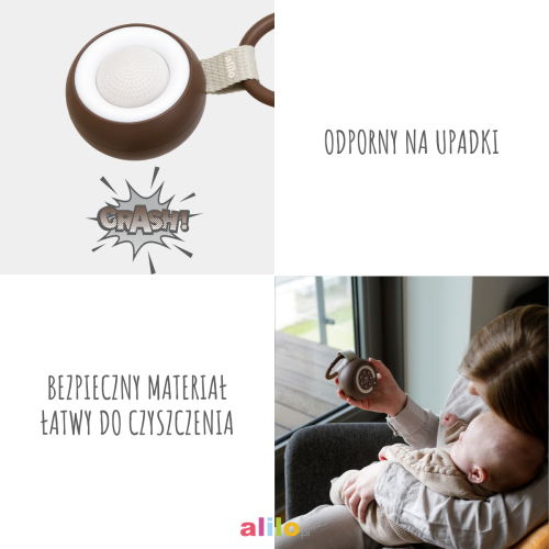 Z łatwością mieści się w dłoni, a dzięki bezpiecznemu pierścieniowi można go wygodnie zawiesić. Idealny do przymocowania do wózka, torebki czy łóżeczka — sprawdzi się doskonale jako pomoc w uspokojeniu maluszka, niezależnie od miejsca.