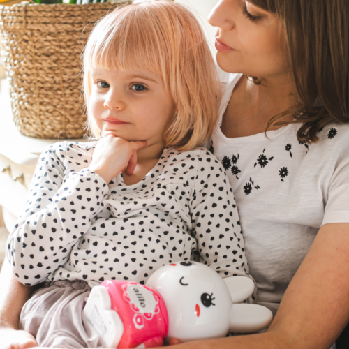 Miękkie uszy króliczka świecą delikatnym światłem zmieniającym kolory i dodają otuchy przy zasypianiu.