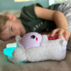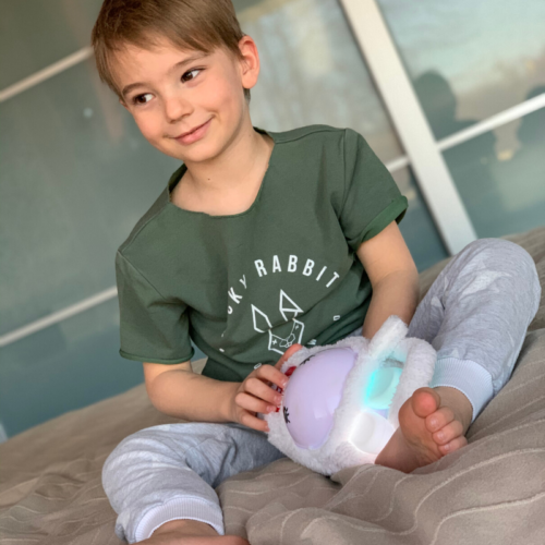 Miękkie uszy króliczka świecą delikatnym światłem zmieniającym kolory dodając otuchy przy zasypianiu.