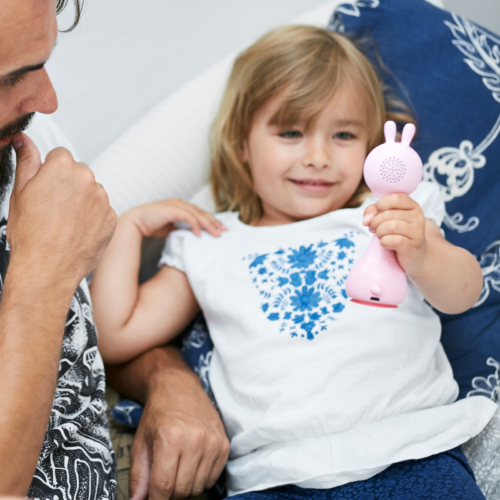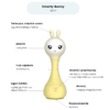 Miękkie uszy króliczka świecą delikatnym światłem zmieniającym kolory i dodają otuchy przy zasypianiu.
