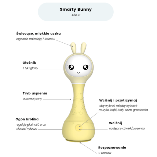 Gwarantuje świetną zabawę z jego świecącymi uszkami. Podobnie jak reszta jego rodziny, może śpiewać piosenki i kołysanki, jednak zna tylko te, które zostały wgrane w naszej fabryce. Smarty świetnie identyfikuje różne kolory – gdy przyciśniesz jego spód do karty z wybranym kolorem, króliczek powie w języku angielskim i polskim, jaki kolor rozpoznaje. Powie też w obu językach, co widzi na karcie z kolorem i odegra dźwięk przypisany do wybranej karty. Uszka zaświecą się na taki kolor, jaki rozpozna Smarty. Został przygotowany na bardzo długą przyjaźń z Maluchem, ponieważ zamiast futerka ma bezpieczne tworzywo ABS, które jest 30 razy mocniejsze niż zwykły plastik!