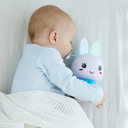 Miękkie uszy króliczka świecą delikatnym światłem zmieniającym kolory dodając otuchy przy zasypianiu.